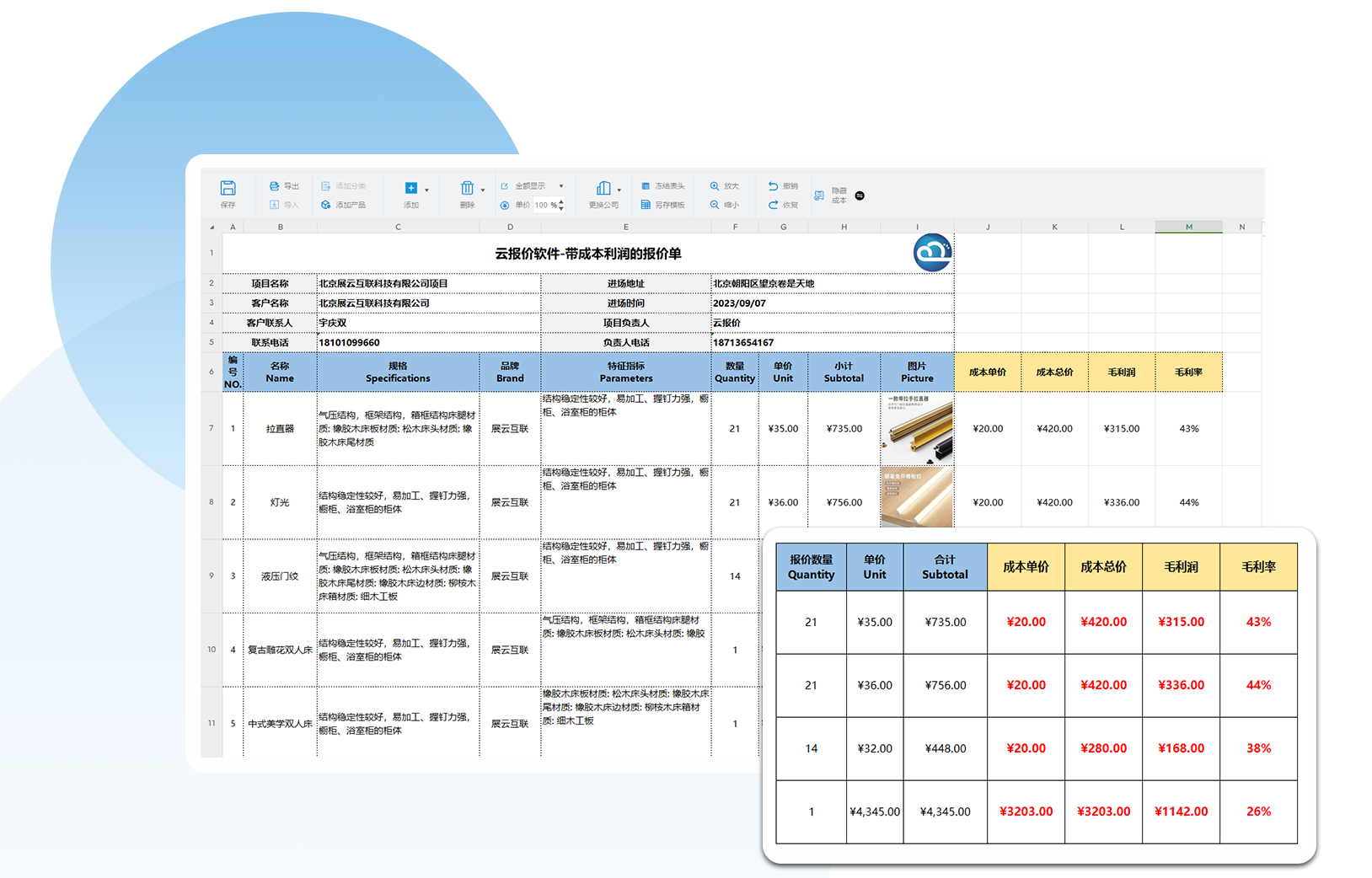 轻松制作带成本及利润的报价单,系统内嵌计算公式,无需人工计算即可直观显示成本总计、利润、利润率。
