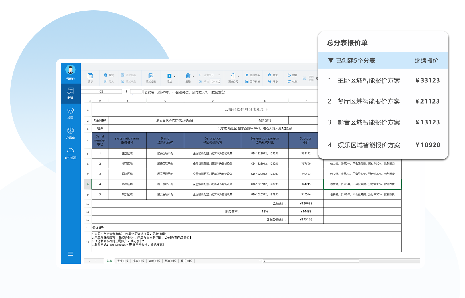 针对大型项目给出的报价方法,解决增项多、组合性强的报价难题,一个总表+多个分表完美呈现专业报价方案。