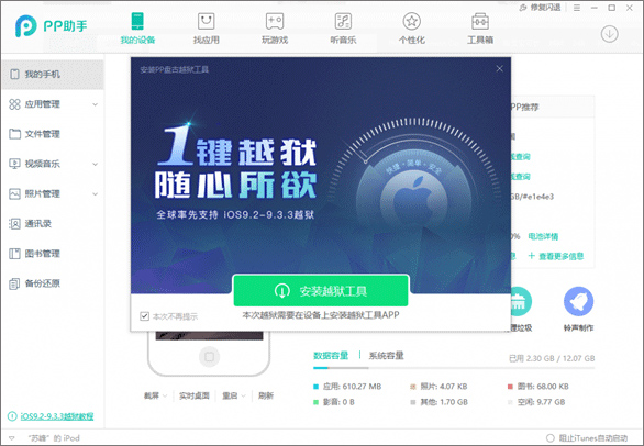 手机设备连接PP助手(PC版5.0软件包中已经附带),点击【一键越狱】按钮,
