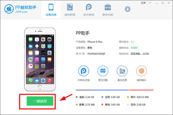 1、手机设备连接PP助手(PC版5.0软件包中已经附带),点击【一键越狱】按钮;