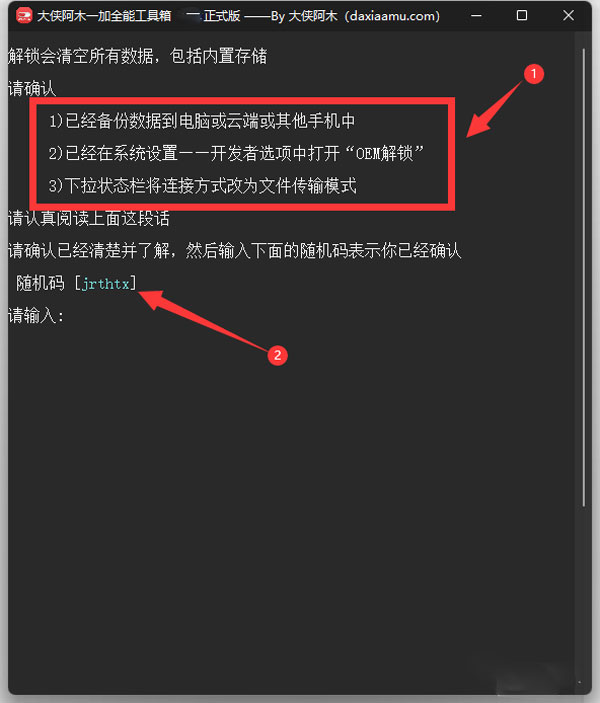 8、以上提示信息确认无误后即可输入随机码,按回车后手机将进入fastboot模式解锁手机BL锁!