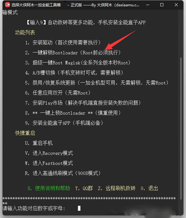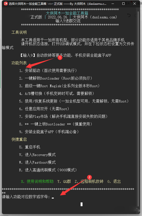 6、随后将手机连接至电脑,打开刚刚下载好的一加全能盒子,然后输入数字“2”