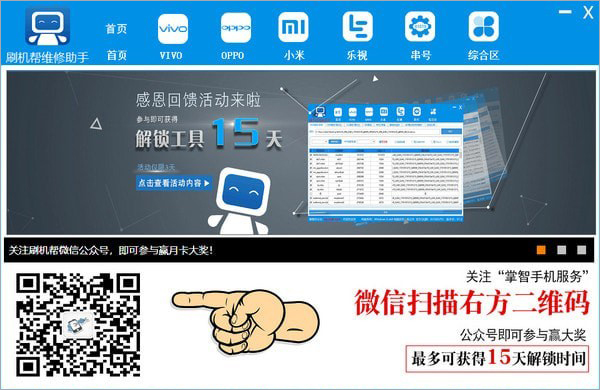 刷机帮维修助手支持时下最流行的手机品牌,包括:OPPO系列 、vivo 系列、小米系列、乐视全系列、奇酷360系列、金立系列、华为系列、9008自定义解锁、MTK 自定义刷机等,支持XP、WIN7、WIN8、WIN10等主流系统,官网实时更新,24小时提供服务,有需求的用户请下载使用!