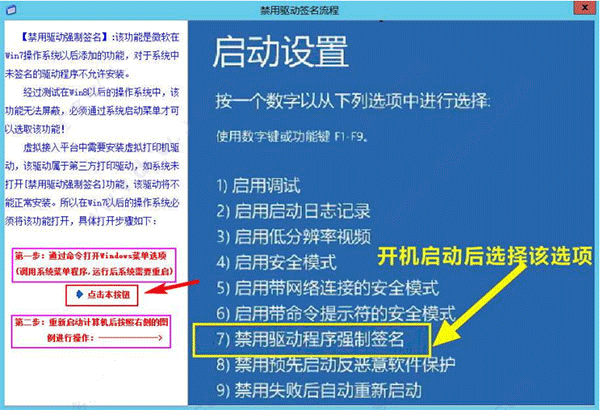3、单击“禁用强制驱动签名”(只有在使用对应版本操纵系统时才会显示)按钮,进入“禁用驱动签名流程”,如下图所示: