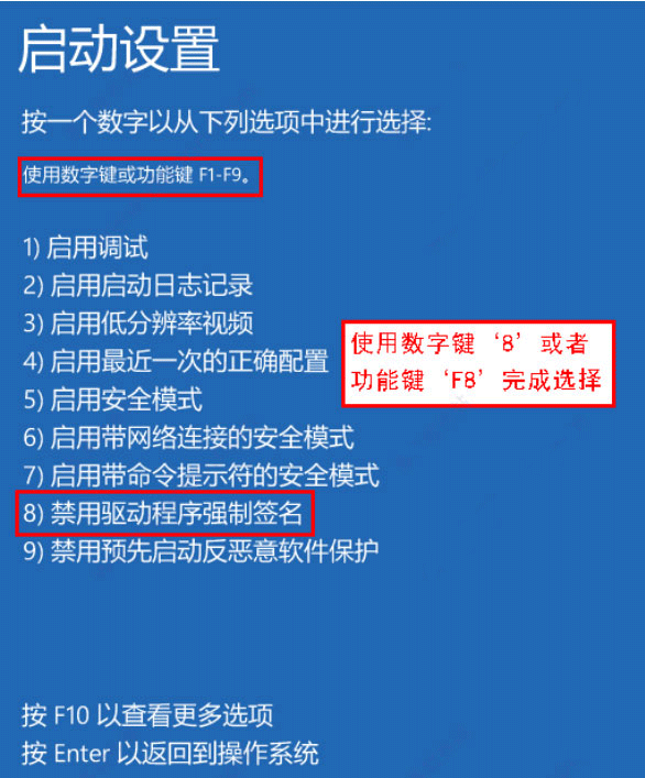 6、重启后在Windows启动菜单中选择“禁用驱动程序强制签名”模式进系统,即可开始安装极通。