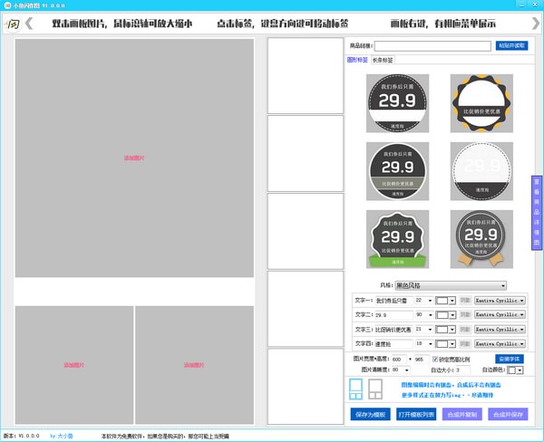 小鱼闪作图官方版是一款简单小巧的招商淘客作图工具。这款工具能够急速闪电作图,使用了易语言自带的画板写的,完全的所见即所得,作图的时候,会有锯齿感,但合成后是没有的!