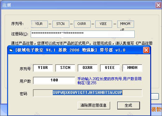 6、提示注册界面,选择安装向导界面的【算号器】选项,将序列号复制到算号器中,点击“生成”按钮即可生成一组注册码,然后将注册码辅助到极域电子教室2010的注册框中,点击“注册”按钮即可激活,表示破解成功,请放心使用。