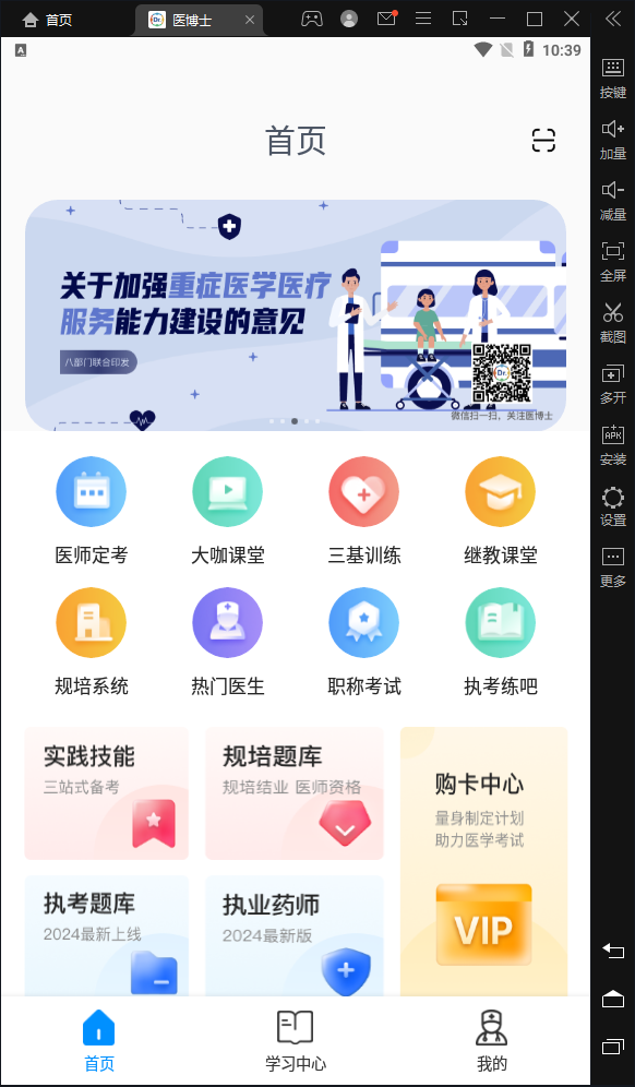 医博士电脑版是借助安卓模拟器运行在电脑上的一款教育平台,由北京亿和博嘉教育科技有限公司专为医学人员打造。该软件集医学培训、在线学习与考试,学习痕迹管理、医学资讯为一体,为医疗卫生技术人员提供优质医学教育内容。软件涵盖了规范化培训、继续医学教育、执业资格考试辅导、医师定期考核、三基在线考试系统等各类培训与考试产品,能够通过线上和线下的相结合的O2O教学模式满足用户不同层次的学习需求。