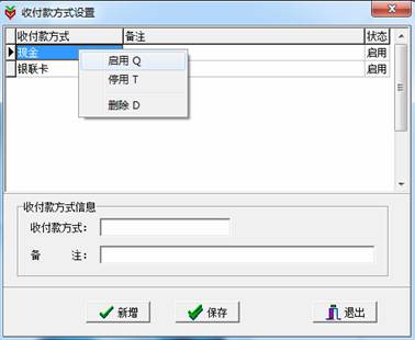 在“收付款方式”列表中选中其中一项单击鼠标右键,可看到“启用”、“停用”和“删除”三个选项。默认情况为启用,如果决定不用该方式进行收、付款了,可以选择“停用”命令。选择“删除”命令则可将此方式删除。