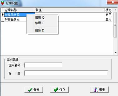 再选择“文件”菜单里第二个子菜单“仓库设置”命令,即可打开“仓库设置”窗口,