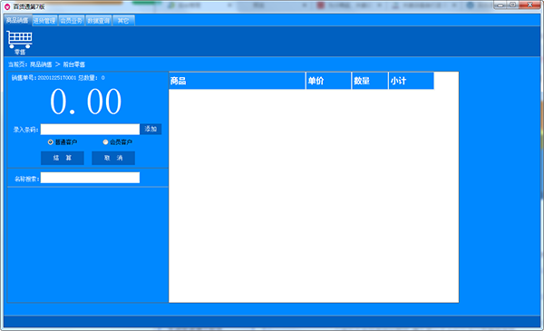 1、首先打开百货通进销存第七版软件,首页如下图所示,可以录入条码,选择普通或者会员客户,点击结算扫码,后面将会有小计出来;