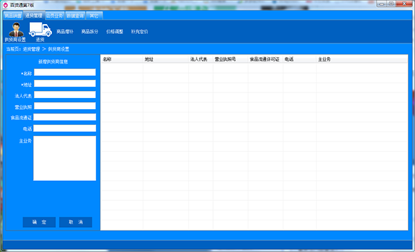 2、点击进货管理,选择供货商设置,输入相关信息,即可看到名称地址、法人代表、营业执照等;