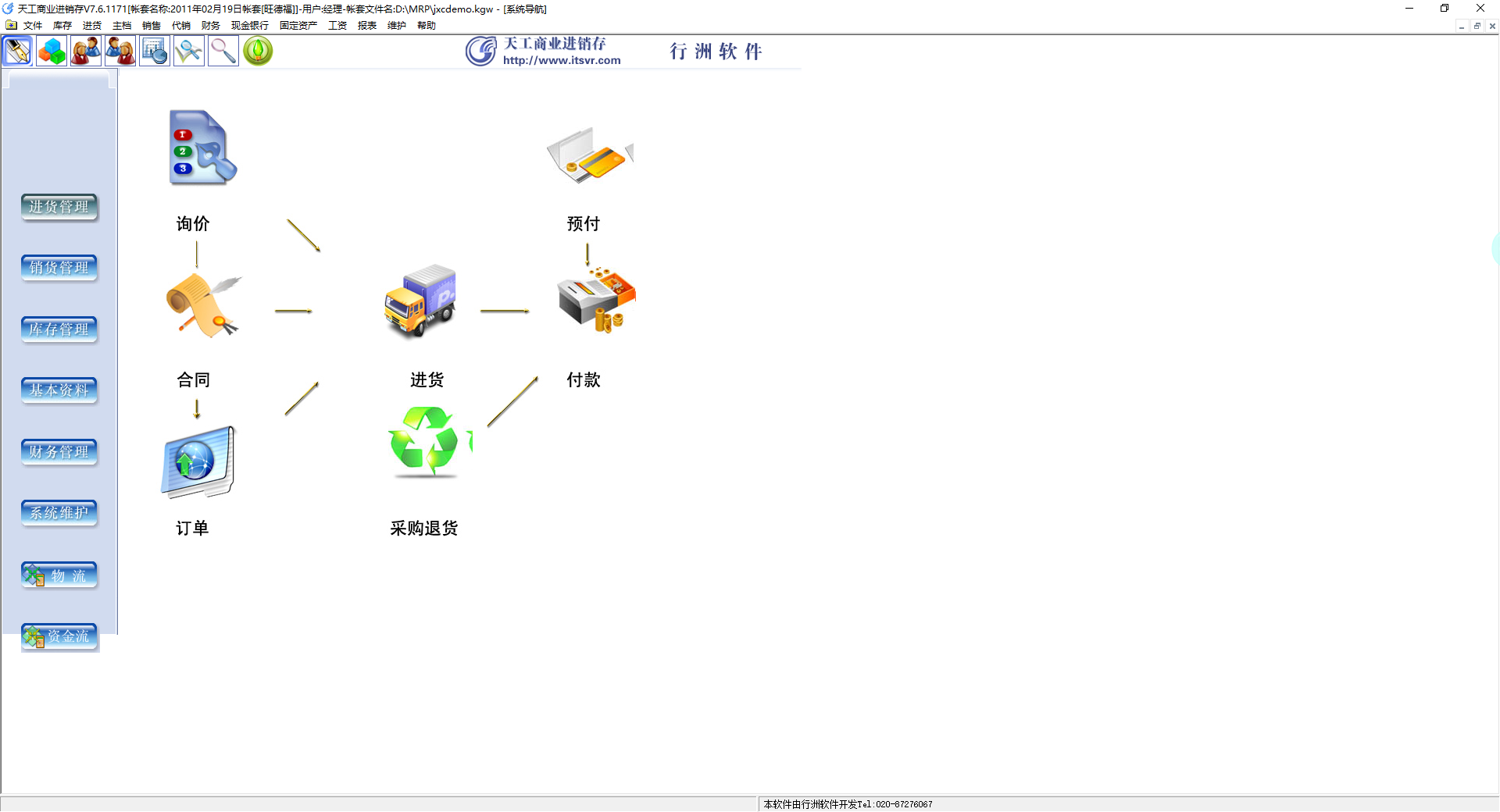 涵盖进货询价,进货订单,进货处理,退货处理,不同厂家进价记忆,进货的现付、月结付款、予付款。