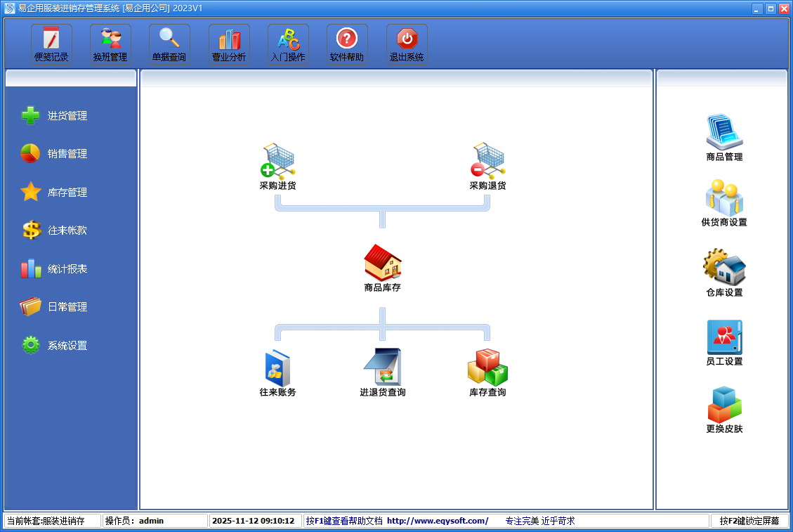 易企用服装进销存软件专为服装、衣帽行业制作的一款进销存管理系统,功能齐全,简单易上手,就算是电脑小白也无需培训就能很快掌握软件操作使用方法。该软件为用户提供了换班管理、进货管理、单据查询、销售管理、营业分析、库存管理、往来账款、便签记录、统计报表、日常管理、系统设置等功能,能很好的满足用户的使用需求。