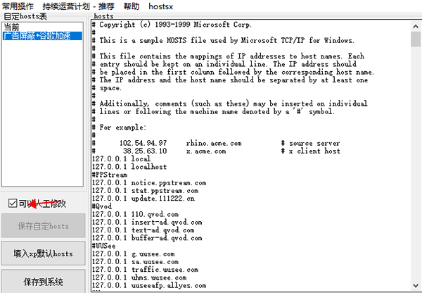 hosts编辑器是杀进程网开发的一款功能实用的hosts文件修改工具,完全免费,即下即用,能够快速帮助用户轻松的编辑系统的hosts文件,并附带了屏幕网络视频广告和谷歌加速的功能,同时支持人工修改,适用于软件开发人员使用。