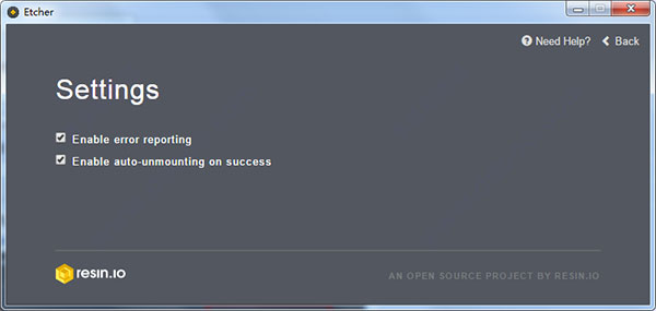 4、下面是Etcher的设置界面,功能也很简单,分别是启用错误报告和启用自动卸载功能,如下图所示: