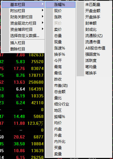 【栏目内容调整】要想更换某一栏的内容,请用鼠标右键点击其栏目名称,然后从弹出菜单上选择新栏目。例,右键点击『现价』栏,弹出菜单后,找到『市盈率』,左键点击它,则该栏目内容换成市盈率。