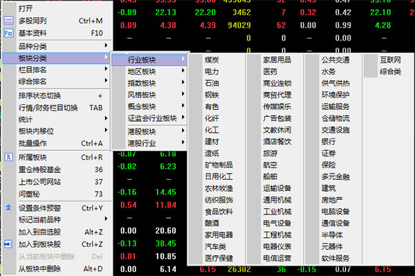 2、点击右键弹出菜单,也可选择不同的股票市场及板块。自选股、板块股、条件选股是系统内置的,分别切换到不同股票群的报价牌。例如,右键点击板块股,会有下面的弹出菜单,供用户切换到其他板块的报价牌。