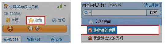 进入房间后,在客户端的左上角会看到“收藏”按钮,点击即可收藏该房间。在大厅首页和IM上可查看收藏过的房间。如下图: