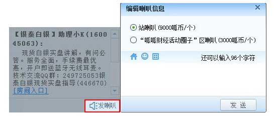 如果您有一些话想发给全站的人,可以使用小喇叭。点击聊天室左下角的“发喇叭”,然后填写信息,点击发送。