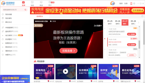 登陆呱呱财经,进入聊天大厅,点击“财经证券”,在右侧的直播间区域显示出财经主题区页面,点击页面上的“免费申请房间”如图: