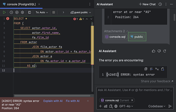 当解释使用所有相关上下文时,它们会更有效。 现在,当您请求 AI Assistant 解释查询时,相应的架构会自动附加到聊天中!