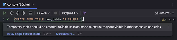 创建临时表时,DataGrip 现在会建议您切换到 Single session mode(单会话模式)。 此模式将允许您在数据库资源管理器中查看这些表。