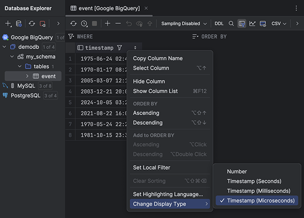 要查看以微秒为单位显示的时间戳,只需右键点击列标题并导航到 Change Display Type(更改显示类型),选择相应的显示类型。