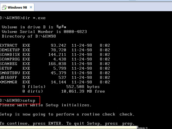 6、输入: "setup" --> 按键 "回车" win98 安装程序! --> 按键 "回车"