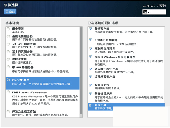 7、软件选择,用户根据自已的应用需要选择基本环境,这里小编选择的是GNOME 桌面版(图形界面),如果是企业级文件存储服务可以选择文件及打印服务器,web服务可以选择基本网页服务器。