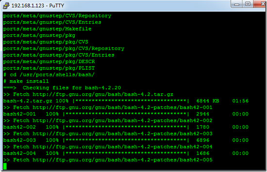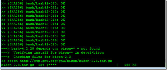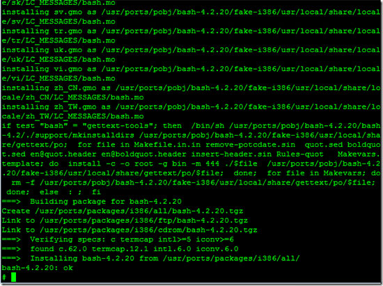 ports安装方式是一种源码编译安装方式,本质是一对makefile文件,安装过程中,会从网络上下载源代码编译安装,会将依赖的包一并编译安装上,openbsd默认没有安装bash,这里我们安装下bash。进入/usr/ports/shell/bash/下执行make install如图: