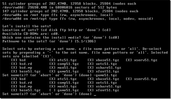 取消选择的包可以使用-包名的方式,如-game51.tgz,选择一个包输入报名回车即可,选择好所要安装的包后回车开始安装openbsd系统。如图: