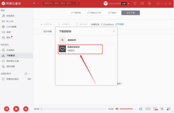 6、接着,网易云音乐便会自动打开,并有一个和 listen1 相关联的“下载到歌单”窗口,在此窗口中,直接点击“我喜欢的音乐”。
