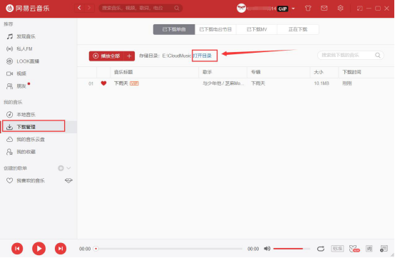 8、当歌曲下载完成后,点击网易云音乐左侧的“下载管理”,在其右侧便会展示出下载的结果,点击“打开目录”。