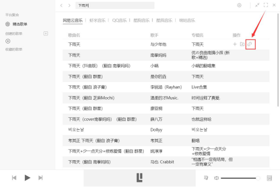 3、此时,listen1 便会将搜索的结果通过列表的形式展示出来,将鼠标移动到自己想要下载的歌曲的“操作”一栏中,便会出现如下图的三个按钮,我们点击“链接”按钮,如下图所示。