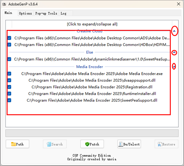 8、然后我们点击Search,会出现两个小标,点击右上角小标志展开,便可以看到需要激活的Media Encoder 2025版本;