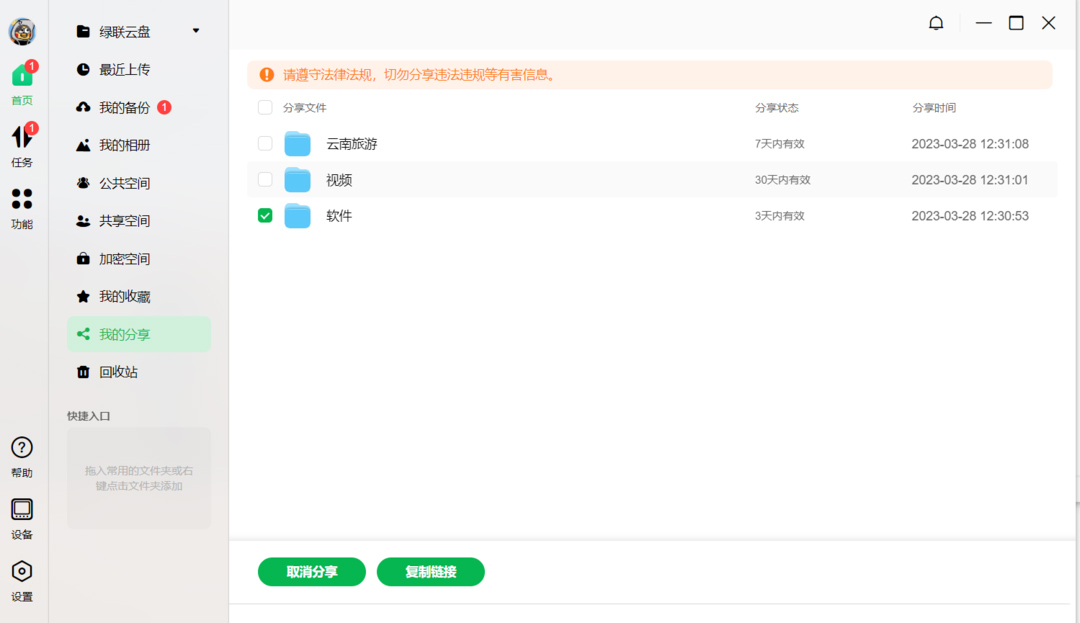 可以展示近期分享过的文件,并对分享文件进行管理。