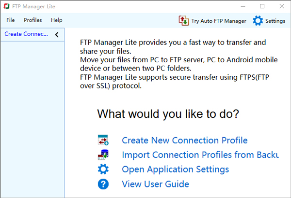 FTP Manager Lite的光滑直观的界面使数据传输变得简单。新连接的配置是连接向导的简单过程。创建连接后,在文件管理器中打开连接,您可以开始移动文件。浏览器风格的文件管理器支持所有标准操作,如删除,重命名,复制等。它还支持拖放,轻松转移,只需滑动鼠标。