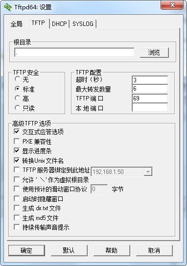 运行程序,在软件主界面单击“设置”按钮,弹出“Tftp64:设置”窗口,可以自定义对TFTP安全性以及高级选项进行相应的勾选配置;