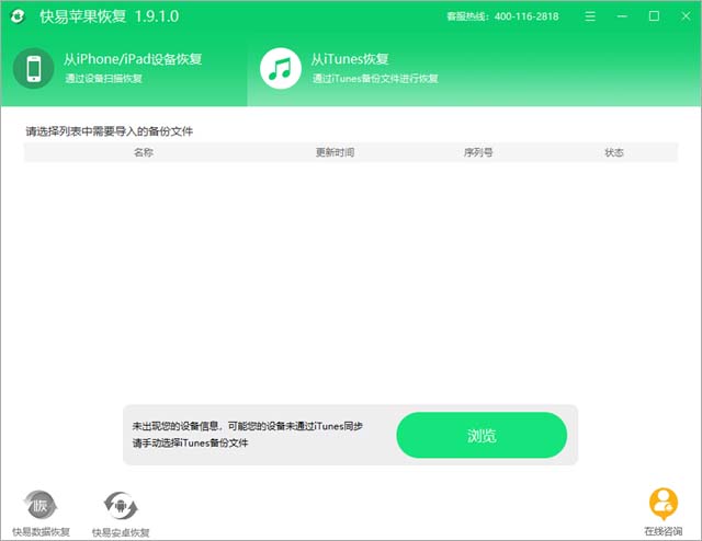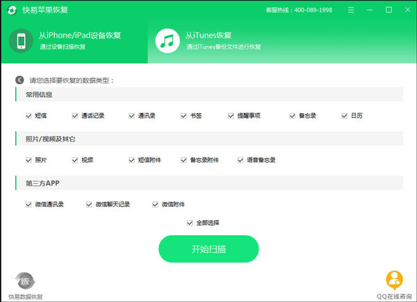 快易苹果恢复软件电脑版是一款功能强大,且十分专业的苹果手机数据恢复软件,可助轻松恢复iPhone、iPad、iPod touch等手机内的通讯录、照片、书签、视频、日历、备忘录、视频、照片、注意、提醒、语音、文件等诸多数据,并且,软件还有着简洁的界面和友好的向导操作,可为你提供三步恢复数据的流程,即使不熟悉电脑的用户也能轻松上手。除此之外,软件还支持一键深度扫描,轻轻松松就能找出隐藏在手机生出的文件,支持一键高效率恢复,可大大增加成功率,有需要的小伙伴,欢迎来多多软件站免费下载体验。