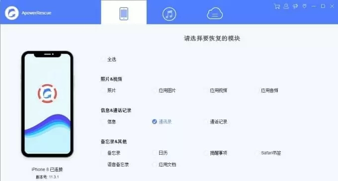 2、在主界面中,点击“全选”就可以恢复所有删除的文件了。也可以选择想要恢复的指定模块,如照片、视频、信息、通讯录、备忘录等。