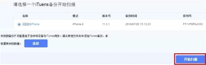注:也可以点击“选择”按键,从其他文件夹中导入iTunes备份。
