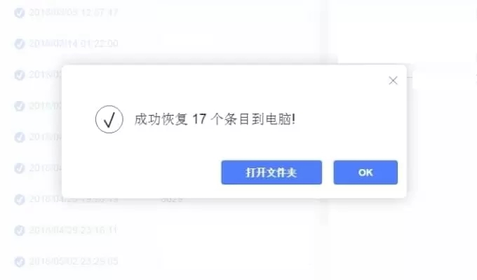 7、传输完成后,可在弹窗中点击“打开文件夹”就能查看恢复出来的文件了。点击“OK”就能关闭窗口了。