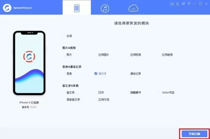 3、点击“开始扫描”按钮,稍等片刻,ApowerRescue马上为你分析及扫描iOS设备。