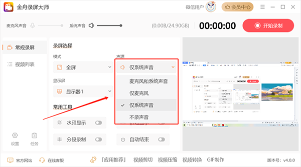 步骤一、双击打开录屏工具,然后选择“全屏”模式;