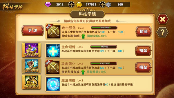 每个军团都有一座科技学院来为成员提供各种各样的加成,军团中的每位成员都能够向指定已解锁科技捐献资源,捐献资源除了可以获得军团币及贡献奖励外,还会提升相应科技的等级和效果。