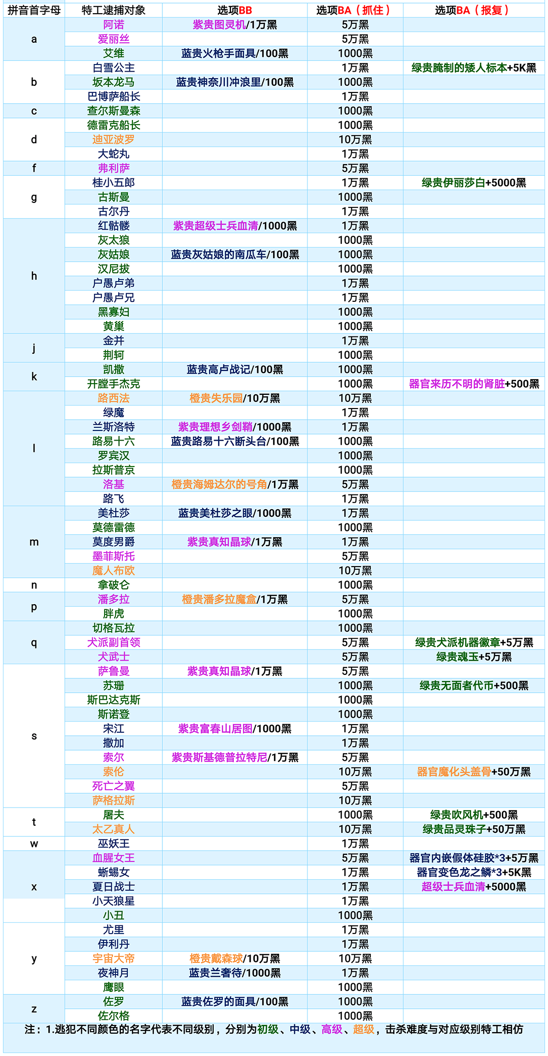1、未满星的贵重碎片(大部分选BB,个别选BA)、未获得且打得过的逃犯绿贵(选BA)2.未到手的特工执照(选AA)