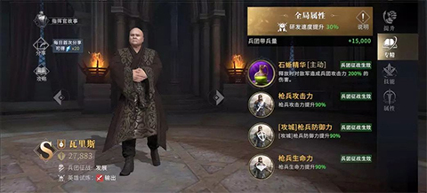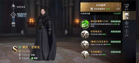 2、除了珊莎·史塔克,S级指挥官瓦里斯同样能提升30%的科技研发速度,A级指挥官兰娜尔·维水也可以增加15%科技研发速度,加速领主前期发育速度。