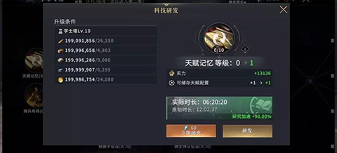 3、并且,指挥官的加速天赋可以累积,举个例子,天赋记忆初始研发时长为12:02:37,当领主得到瓦里斯和珊莎·史塔克并培养到金色品质之后,实际时长就缩短到6:20:20(珊莎30%+瓦利斯30%+30级学士塔30%),减少了6个小时左右,以此拉开优势。