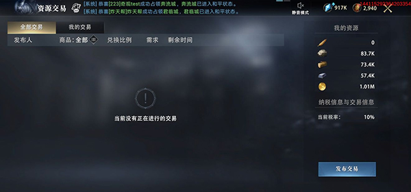在资源交易界面,领主们可以发布交易,出售自己已有的资源兑换另一种想要的资源。可交易资源在粮食、石料、木材、铁矿与金币中选择,且上架资源需扣除税率。如当前税率为10%时,上架1w资源进行交易,会扣除1w*10%=1k的税,实际上架9k资源进行交易。